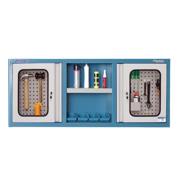 O AM-51 tem dois painéis para ferramentas, tem um amplo espaço central com prateleira regulável e uma prateleira fixa.